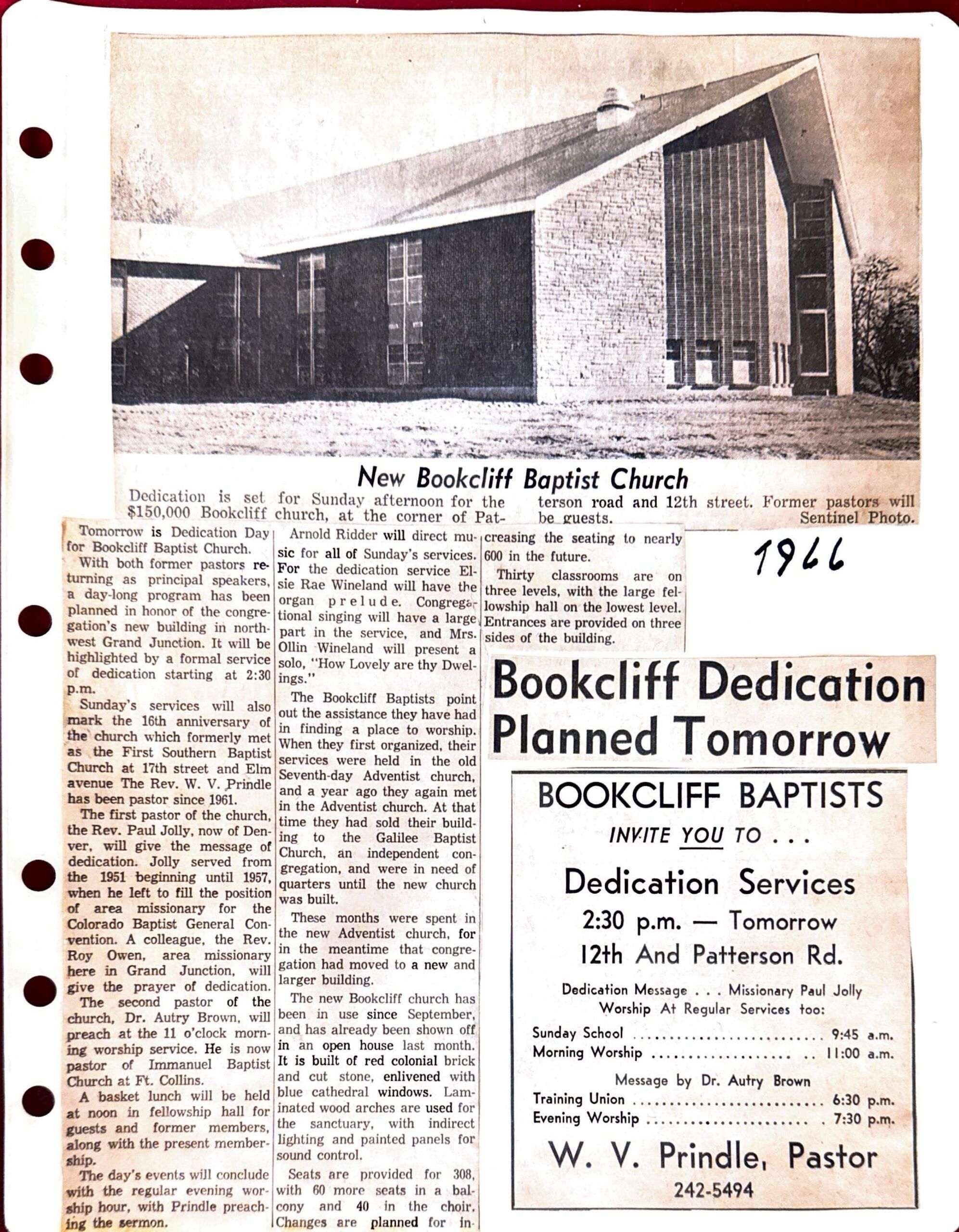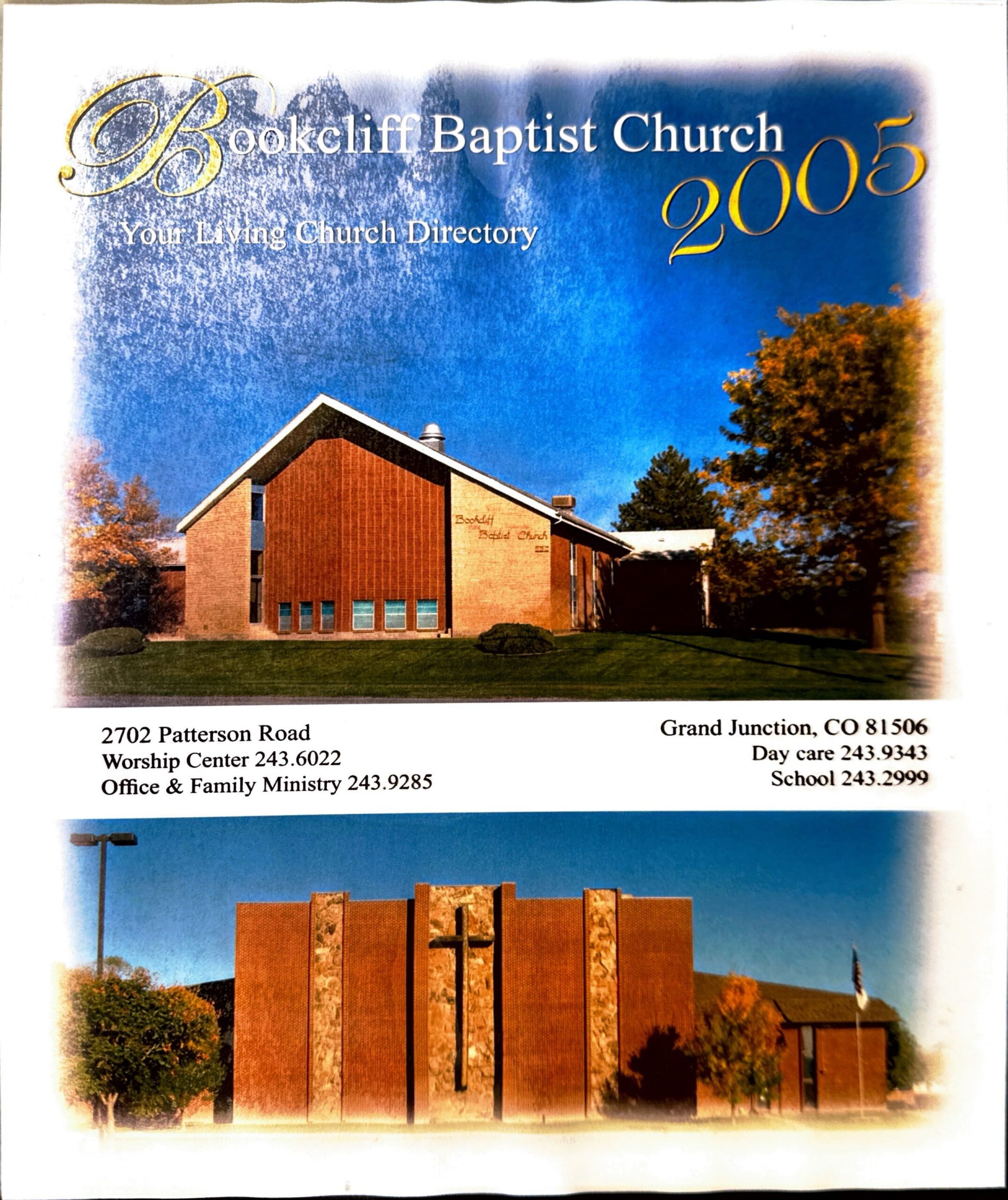 Bookcliff Baptist Church was organized on November 8, 1950 as First Southern Baptist Church of Grand Junction with 56 charter members. The first permanent place of worship was built at 17th and Elm in 1953. Until that time the congregation met at various locations. In 1968 the church moved to 12th and Patterson and changed the name to Bookcliff Baptist Church. The Family Ministries building was completed in 1983.